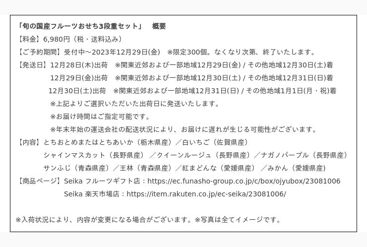 株式会社 船昌(本社:東京都大田区、代表取締役:関野 裕)は、フルーツギフトのオンラインショップ「Seika フルーツギフト店」と「Seika 楽天市場店」にて、「旬の国産フルーツおせち3段重セット」のご予約受付を開始いたしました。