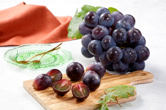 光沢のある深い紫黒の果皮と歯切れのいい果肉を持つ、大粒の黒ぶどう。