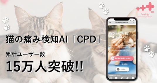 株式会社Carelogy(本社:東京都中央区, 代表取締役:崎岡豪)は、猫の顔写真から痛み表情を判定することができるAIサービス「CPD: Cat Pain Detector(キャット・ペイン・ディテクター)」のユーザー数が15万人を超えたことをご報告いたします。
