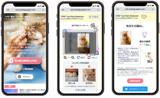「CPD」とは、当社株式会社Carelogyと動物のいたみ研究会(代表:枝村一弥・日本大学)で共同開発された、猫の顔写真から痛みを抱えているかどうかを精度95%以上で判定できるAIを搭載した無料のWebアプリです。