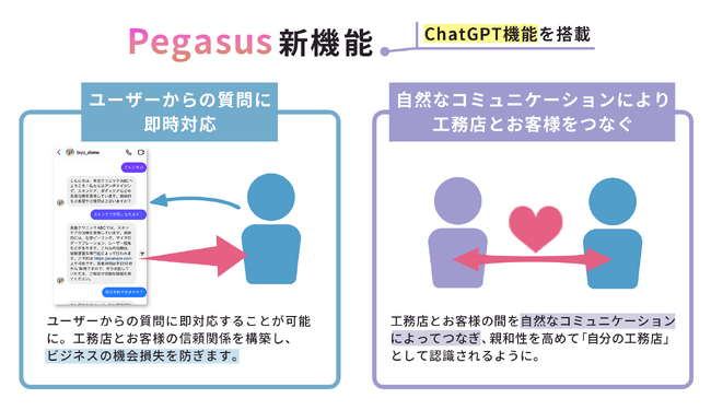 2021年7月1日に実装したPegasus(ペガサス)に、2023年7月より新しくChatGPT機能が搭載されたデモアカウントを5社限定で提供させていただきました。ChatGPTは、2022年11月にOpenAIが公開した、自動応答チャット生成AIであり、従来のPegasusチャットbot機能よりも円滑なコミュニケーションが可能になり、工務店様のカスタマーサポート事業の力になれると考えております。当初、5社限定で始めましたところ、予想よりも問い合わせが多く、また世界的に見て、ChatGPTの成長の速さからより多くのお客様に使用いただき、サービス向上の為に使用者様の声をお聞きしたいと考え増枠することを決定いたしました。