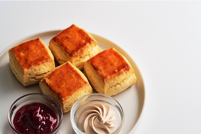 ペルーナティーボのカカオハスクのシャンティと自家製のジャムを添えて、自家製スコーンは焼き立てをご用意致します。