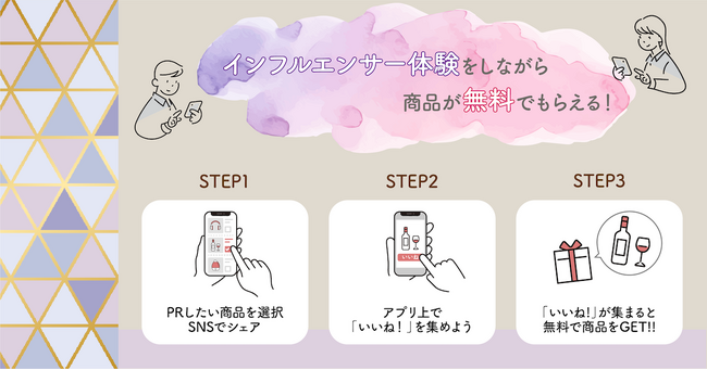 誰もが気軽に、まるでインフルエンサーであるかのような”PR活動”を行うことができるアプリです。SNSのフォロワー数などによる登録制限はなく、お好きな時にお好きな商品をSNSでPRしていただきます。7日間以内に所定数の「いいね!」をアプリ内で集めるとPRが達成、報酬としてその商品を無料でお手元にお届けします。