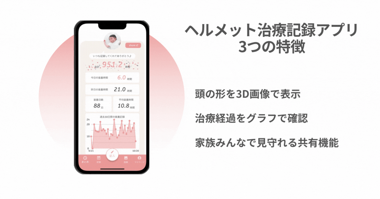 ヘルメット治療の効果を高めるには、装着時間が鍵を握ります。しかし、赤ちゃんの月齢が小さい時期に子育てをしている中で毎日のヘルメットの装着時間を記録するのはなかなか大変です。また、毎日見る赤ちゃんの頭の形の変化に気付きにくいこともあります。そこで開発されたのが「ヘルメット治療記録アプリ-babyband」です。装着時間の記録が簡単にでき、赤ちゃんの頭の形の治療経過を3D画像やグラフで可視化できるヘルメット治療サポートアプリです。記録した内容は、家族で共有することができます。