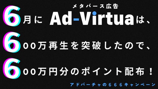 メタバース広告配信プラットフォーム「Ad-Virtua」の開発・運用を行うアドバーチャ株式会社(所在地:東京都渋谷区、代表取締役:水野 征太朗)は、2024年6月に累計600万回再生を突破したことを記念して、7/1(月)より「総額600万円!先着60社×10万円分メタバース広告無料出稿キャンペーン」を開催します。