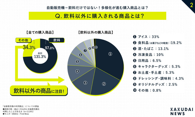 「飲料」に続き購入されていた商品は『アイス(11.3%)』『食料品(お菓子などの軽食)(6.6%)』『酒・たばこ(4.5%)』『冷凍食品(3.4%)』と続きました。