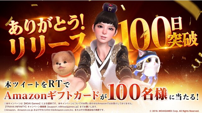 人気MMORPG「TRAHA」のスピンオフ作品にあたるスマートフォン向けタイトル『TRAHA INFINITY』の開発会社である株式会社MOAI GAMES(代表取締役社長:イ・チャン)が、6月7日(水)にリリース100日を迎えました。