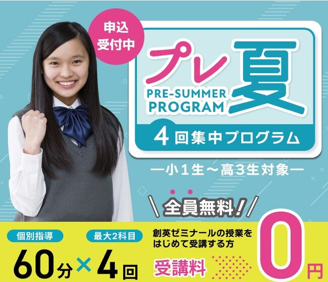 株式会社創英コーポレーション(本社:神奈川県横浜市、代表取締役:豊川 忠紀)が運営する個別指導塾創英ゼミナールは、テスト対策や学習習慣の定着に向けた「プレ夏」講座の申込受付を開始しました。小学生~高校生を対象にしたお得な「プレ夏キャンペーン」も5月15日(月)~6月16日(金)まで実施します。また、夏期講習の申込受付も開始しました。