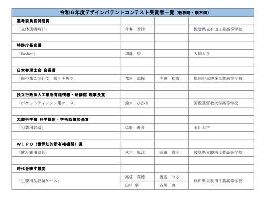 文部科学省・特許庁等が主催する「パテントコンテスト/デザインパテントコンテスト」は、全国の高校生や大学生等が創造した発明及びデザイン(意匠)のうち優秀なものを表彰し、特許・意匠登録への出願を支援することで若い世代の知的財産権制度への理解を深めることを目的としたコンテストです。