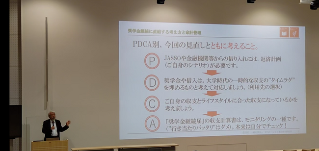 昨年に引き続き「奨学金減額の指導対象者向け」の説明会ということで、今回は、学生の「見直す力=生き抜く力」をコンセプトに、PDCAを使った新機軸での資料を作成しました。