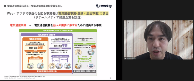 顧客事例として、まずは株式会社unerry プロダクトマネージャー 島田崇史氏が登壇しました。島田氏は、改正電気通信事業法について、電気通信役務を他人の需要に応ずるために提供する事業者も対象に含まれることを強調し、「後追いで法整備が進んでいる。法整備を超えてプライバシー全体を考える体制・配慮を見直すべき分岐点にきている」と述べました。そして島田氏はSnowflakeデータクリーンルームに言及しつつ、「単純にツールを提供するだけでなく、プライバシー規制を理解したパートナーの存在がより重要になってくる」と総括しました。