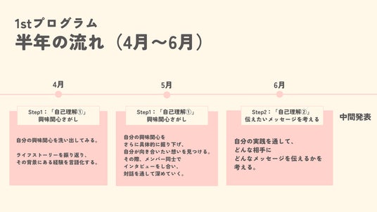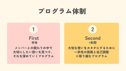 「1st :自己理解プログラム」は、6ヶ月間、「2nd :自己探求プログラム」は1年間のプログラムとして構成されています。