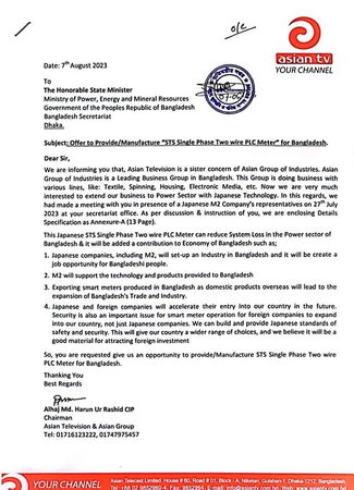 2023年2月16日よりバングラデシュ・ダッカ地区に電力を供給するDESCO社と実施しておりましたM2製スマートメーターの実証試験が問題なく終わったことで、バングラデシュ国営電力会社へ導入提案するにあたり、弊社製品の供給・設置・アフターサービス・その他の関連ソリューションについての事業提案を求められ、当該提案書を作成の上、ハミド大臣へ直接説明し事業提案を受理されたものです。