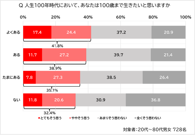 100歳まで生きたい意向についてQ1の内訳別に質問したところ、食事で幸せになった経験が「よくある」人の41.8%が「とてもそう思う」もしくは「ややそう思う」と回答し、経験がない人の32.4%と比べて9.4ポイント高い結果となりました。また、「ある」人の38.9%、「たまにある」人の35.1%が「とてもそう思う」「ややそう思う」と回答しました。
