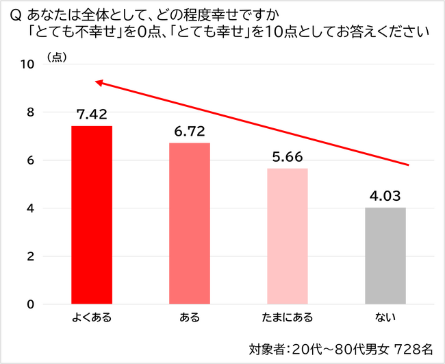 Q1の内訳別に、現在の幸福度(10点満点)を比較しました。その結果、食事で幸せになった経験が「よくある」と回答した人は7.42点で、ない人の4.03点と比べて3.39点の差がありました。また、「ある」人の幸福度は6.72点、「たまにある」は5.66点でした。