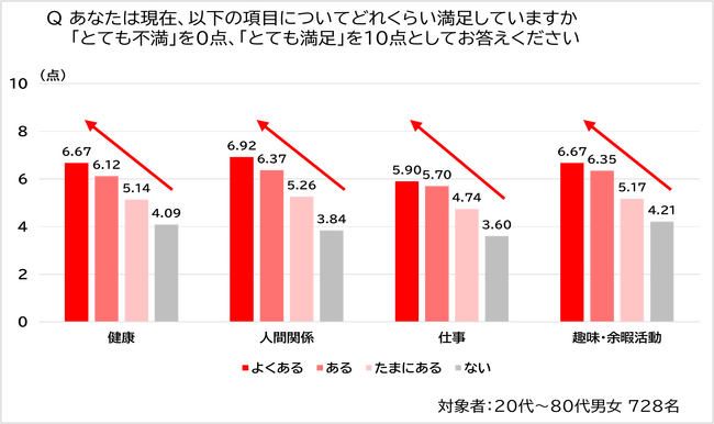 ■Q3. あなたは現在、「健康」「人間関係」「仕事」「趣味・余暇活動」についてどれくらい満足していますか。