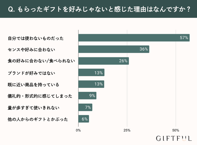 好みではないと感じた理由は、「自分では使わないものだった」が1位で57%。さらにセンスや好みに合わない、食べられない、などの理由が続きました。