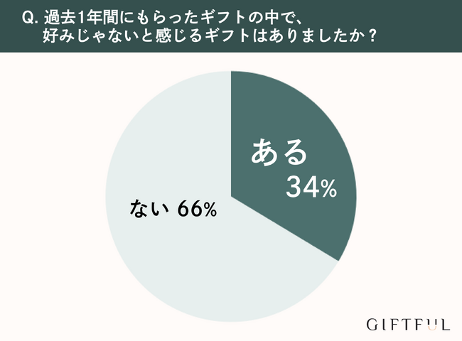 過去1年間において1つ以上のギフトをもらった方の中で、好みではないギフトをもらったことがあると回答した方は34%でした。