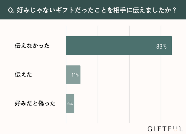 贈ったギフトが相手の好みではなかったことを贈り手は気づいているのか。アンケートでは、相手に伝えなかった方が83%。好みだったと偽った、という方も6%いました。相手との関係性にもよりますが、贈ってくれたこと自体は嬉しいし、自分のことを想って贈ってくれたものだからこそ、言えない、あえて言わない方が多いようです。