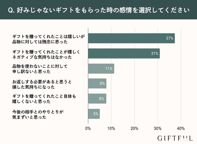 一方で、品物に対して残念な気持ちを持ってしまった方が37%と、好みではないギフトを受け取った際に、その品物に対してのイメージに影響を与えることもわかりました。