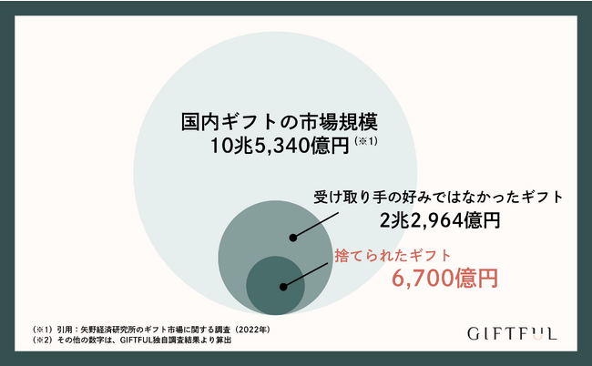 (※3)好みではなかったギフトの総額・総数に対して、好みじゃないギフトを捨てた方・保管している方の割合を掛けて算出(ex.好みではなく捨てられたギフト総額 6,700億円=好みではないギフト 2兆2,964億円×捨てた割合 29.2%)