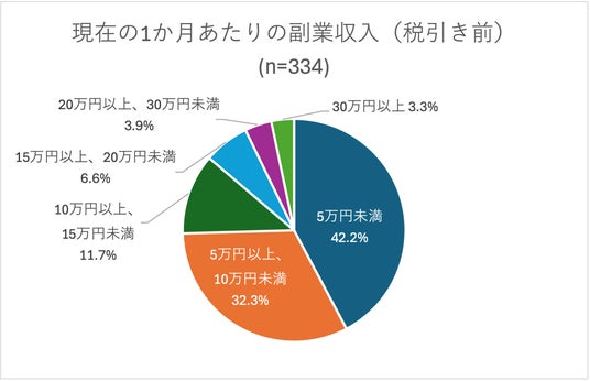 1か月あたりの副業収入(税引き前、直近1年間の平均値)について全体に質問したところ、最も多かった回答は「5万円未満」で42.2%でした。副業収入が上がるにつれて回答が少ない傾向にあり、15万円以上の回答を合計すると全体の1/4強となっています。