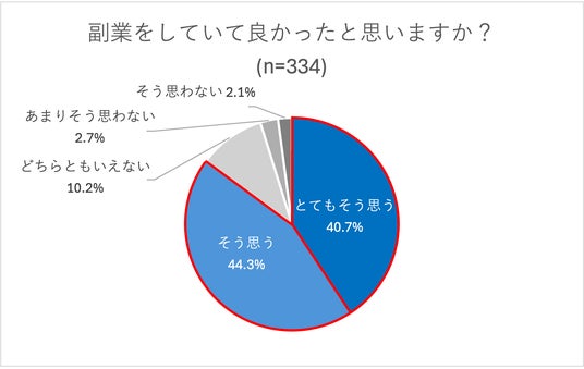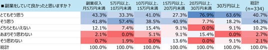 ・85%以上が「副業をしていて良かった」と回答。副業月収5万円未満でも9割が満足しており、収入と満足度は比例せず