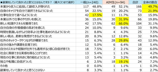 副業していて良かったことについての質問(最大3つまで選択)では、「本業から収入に追加して副収入が得られた」という回答が一般・AIM生ともに約半数に上り、副業の最大の目的である収入面のメリットが達成されている状況がうかがえました。