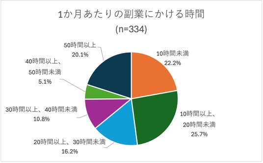 1か月あたりの副業にかける時間(直近1年間の平均値)について全体に質問したところ、最も多かった回答は「10時間以上、20時間未満」でした。また「10時間未満」が22.2%、「50時間以上」が20.1%とばらつきがあることが分かりました。