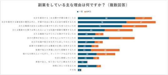 一般およびAIM生に「副業をしている主な理由は何ですか?」(複数回答)という質問をしたところ、いずれも「生計を維持する(生活費や学費を稼ぐ)ため」あるいは「生計を維持する最低限の費用以外に、貯蓄や自由に使えるお金を確保するため」といった収入に関する回答が最多となりました。