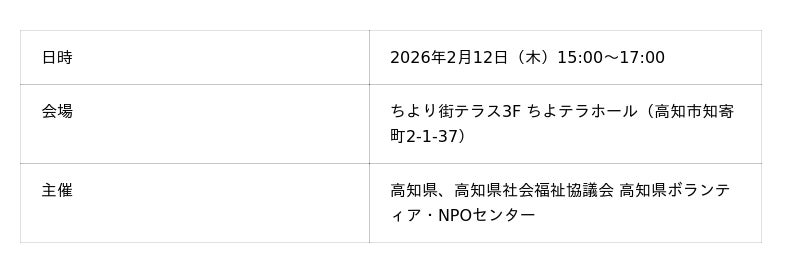 また、本取組は、高知県社会福祉協議会とJVOADが協働で実施する「災害支援そなえ令和基金」の助成事業での、県内におけるネットワーク形成や官民連携の取組の一環として位置づけられるものです。