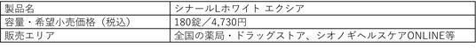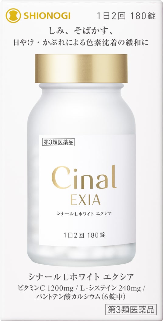 シナールLホワイト エクシア (第3類医薬品)ビタミンC1,200mg、L-システイン240mgを配合(6錠中)したビタミンC主薬製剤。身体の内側から代謝を促すはたらきをもつ「L-システイン」が、表皮の奥深くにあるメラノサイトにアプローチし、メラニンの生成を抑制。また、ビタミンCの働きによりできてしまった黒色メラニンも淡色化します。さらに、肌の正常なはたらきをサポートする肌活性化成分として、ビオチン、パントテン酸カルシウム、ビタミンB6を配合。細胞レベルのシミ対策を促します。
