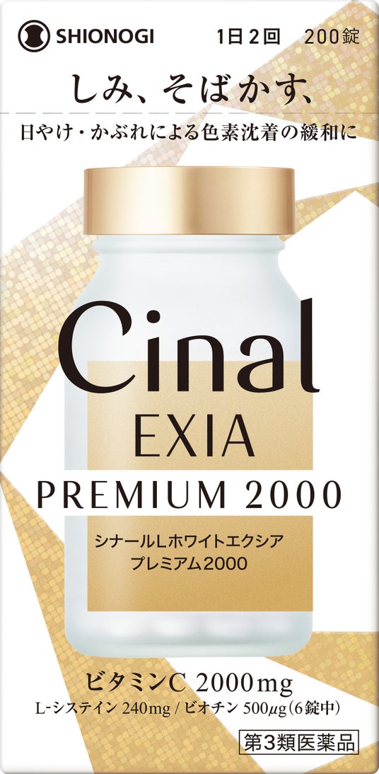 シナールLホワイトエクシア プレミアム2000(第3類医薬品)「5つの有効成分を承認基準内※1 最大量配合!」シナール史上シミ対策成分※2を最大量配合。ビタミンC2000mg・L-システイン240mg(6錠中)に加え、配合比率・成分選定にもこだわった肌細胞と関わりの深い成分ビオチン、パントテン酸カルシウム、ビタミンB6を承認基準内※1最大量配合しています。メラニンの生成を抑制し、淡色化、代謝促進のサイクルで、表出化したシミを改善します。