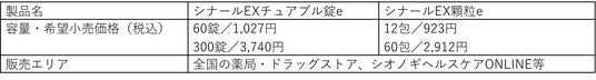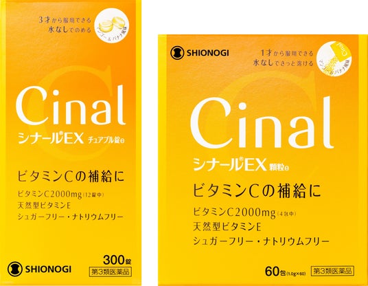 シナールEXチュアブル錠e/シナールEX顆粒e (第3類医薬品)3種の有効成分を配合し、しっかり摂りたいビタミンC習慣のサポートを行います。ビタミンC2000mg(チュアブル錠:12錠中/顆粒:4包中)に加え、抗酸化作 用をもつ天然型ビタミンE、肌の正常な働きをサポートするビタミンB2誘導体を配合しています。シュガーフリー・ナトリウムフリー設計で、幅広い年代の方にご利用いただけます。マンゴー&バナナ風味。