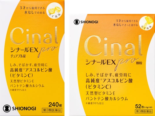 シナールEX proチュアブル錠/シナールEX pro顆粒(第3類医薬品)proならではの充実成分を配合。純度99%以上の高純度アスコルビン酸(ビタミンC)が肌細胞に直接アプローチする他、抗酸化作用のある天然型ビタミンE、肌の働きに関わるビタミンB2誘導体、さらに、パントテン酸カルシウムをプラスしました。ゆず風味。