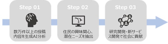 生成AIを用いて、数万件以上の住民による日常的なアプリへの投稿内容等をデータ分析しています。防災や共助に関する要望・要件を抽出、大学や他社との共同研究やサービス改善に活用しています。