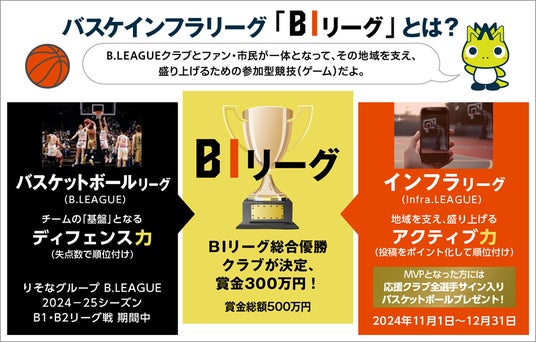 バスケインフラリーグ「BIリーグ」では、「バスケットボールリーグ部門(B.LEAGUE)※1」と「インフラリーグ部門※2」の2つから構成され、両部門の順位を合算して「バスケインフラリーグ(BIリーグ)」の総合優勝クラブを決定します。総合優勝クラブには、優勝賞金300万円が贈呈されます。また、最多投稿ポイント獲得者(MVP)や印象的な投稿をしてくださったファン・市民の方(MIP)には、個人賞として素敵な賞品をプレゼントいたします。