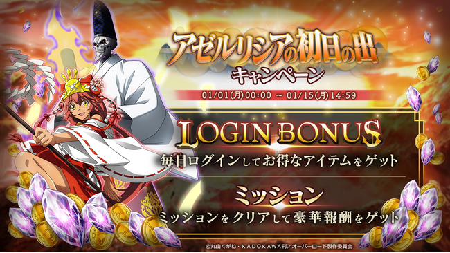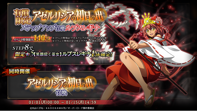 1/1よりイベント『アゼルリシアの初日の出』を実施!召喚では『★5 【笑顔招く巫女】 ルプスレギナ』『★5 【至高の神主】 モモンガ』も登場します!