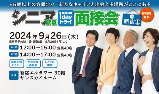 公益財団法人東京しごと財団(所在地:東京都千代田区)は、東京都内での就業を希望される55歳以上のシニアの就職・再就職の支援を目指し、今年度のイベント第2弾として9月26日(木)開催「シニア就職1dayトライ面接会in新宿1」のお申込みを8月26日(月)より受付開始いたします。