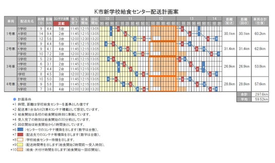 学校給食センターから小中学校など各施設への配送は「調理後2時間以内に喫食」できるよう努める必要があります。これを遵守するためには各施設の給食時間やコンテナ台数を考慮しつつ、トラックの効率的な巡回ルートを計画しなければなりません。昨今の人手不足下では、トラックの台数を最小化して運転手を最少人数とすることも求められており、巡回ルートを考えるのは非常に現場負担の高い手間のかかる作業となっていました。