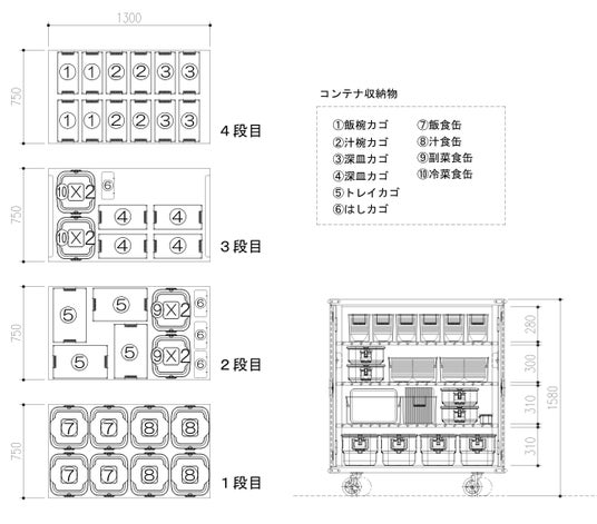 今回当社とpluszeroが開発したシステムでは、食器の形状や数が決まった状態から、クラスの数や児童の人数をパラメータとして入力することで、食器カゴへの詰め方、コンテナやカートなどへの積載位置について給食の入った食缶との組み合わせも考慮しながらシミュレーションを行い、最適な積載方法を提案することができます。