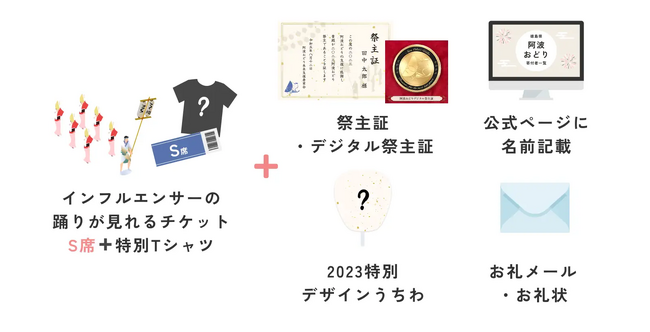徳島県内や近郊の方々だけでなく、日本全国、あるいは世界中にいる阿波おどりを愛する全ての人々が本クラウドファンディングへの参加を通じて、「阿波おどりの祭主2023」としてお名前を永久に残していく仕組みです。ご支援いただいた実績を、公式ウェブサイトに掲載するほか、紙面で「祭主証」をお届け。さらに改ざんすることができず、未来永劫残り続けるデータとして「阿波おどりのデジタル祭主証」としてお渡しいたし、お届けいたします。この「一口祭主」は日本で初めての取り組みです。