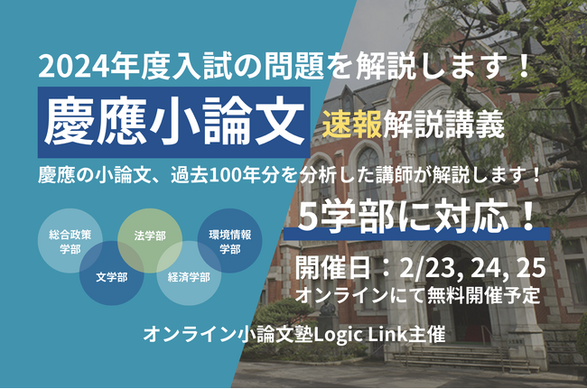 小論文の指導に力を入れ、オンラインで小論文指導塾を展開する株式会社Logic Linkが『慶應義塾大学2024年度入試、小論文学部別速報解説講義』を開催することをお知らせします。慶應義塾大学、文学部・総合政策学部・法学部・環境情報学部・経済学部の小論文の論点や使うべき具体例、今年度の入試で問われていることなどを解説します。早くて1週間後に返却される添削特典付き(1学部まで受講可)です。
