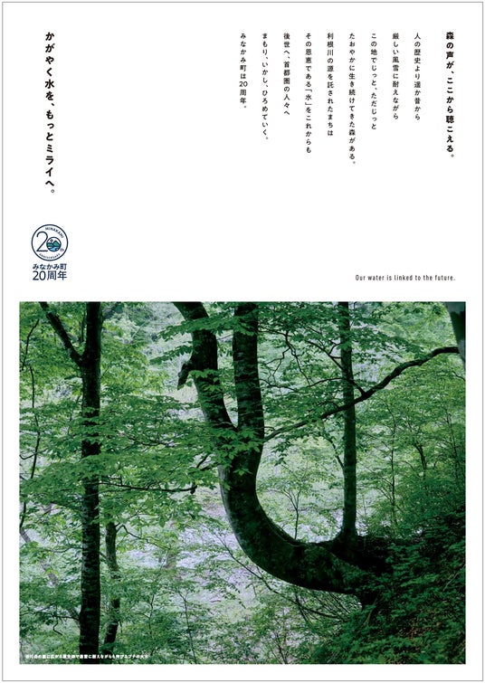 また、本ビジュアルには「かがやく水を、もっとミライへ。」というキーワードが掲げられています。これは、首都圏3,000万人の暮らしを支える水源地としての使命と責任を改めて胸に刻み、清らかな“水”──すなわち、この町に息づく多様な自然資源の象徴──を、未来へ、さらには下流域をも含意する“ミライ”へと確かにつないでいきたいという思いを託したものです。