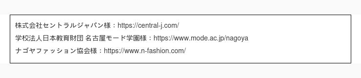 【後援(公的機関)】日本貿易振興機構(ジェトロ)名古屋貿易情報センター・中華人民共和国駐名古屋総領事館・愛知県・三重県・名古屋商工会議所・(一社)東海日中貿易センター・ナゴヤファッション協会