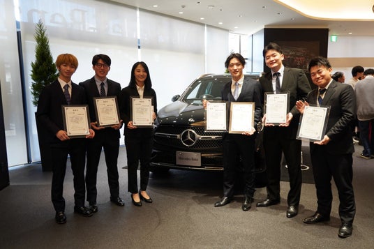 メルセデス・ベンツGLCの前で獨協受賞メンバー記念撮影