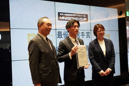 表彰式では、優勝した獨協医科大学や、MVP(最優秀選手賞)に輝いた柏原達之介選手(獨協FW)、女子優秀選手に贈る久保英恵賞を受賞した小池百合乃選手(獨協FW)をはじめとする表彰選手に、宮園輸入車販売株式会社赤須惣一社長よりトロフィ、表彰状、副賞が贈呈されました。