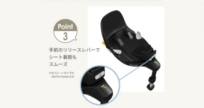 SLIDE TECH搭載の「360PRO FAMILY」は専用ベースメント「FAMILY FIX360PRO(ファミリーフィックス360プロ)」をご使用の上、お子さまの使用月齢やライフスタイルに合わせて、「PEBBLE360PRO(ペブル360プロ)」、「PEARL360PRO(パール360プロ)」2種類のチャイルドシートからお選びいただけます。