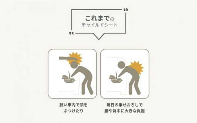 チャイルドシートの乗せ降ろしはママパパにとって大きな負担を強いられる動作のひとつ。首の座らない新生児の赤ちゃんから平均体重15kgの4歳くらいの幼児まで、抱っこをして持ち上げ、狭い車の座席スペースに乗せ降ろしする度に、無理な姿勢によって腰を痛めたり、車の天井やドアの縁に頭をぶつけてしまうという苦労がありました。