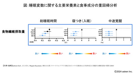 3.食物繊維の摂取量:より多く摂取している人は、総睡眠時間・中途覚醒・寝つき(入眠)において改善が見られた